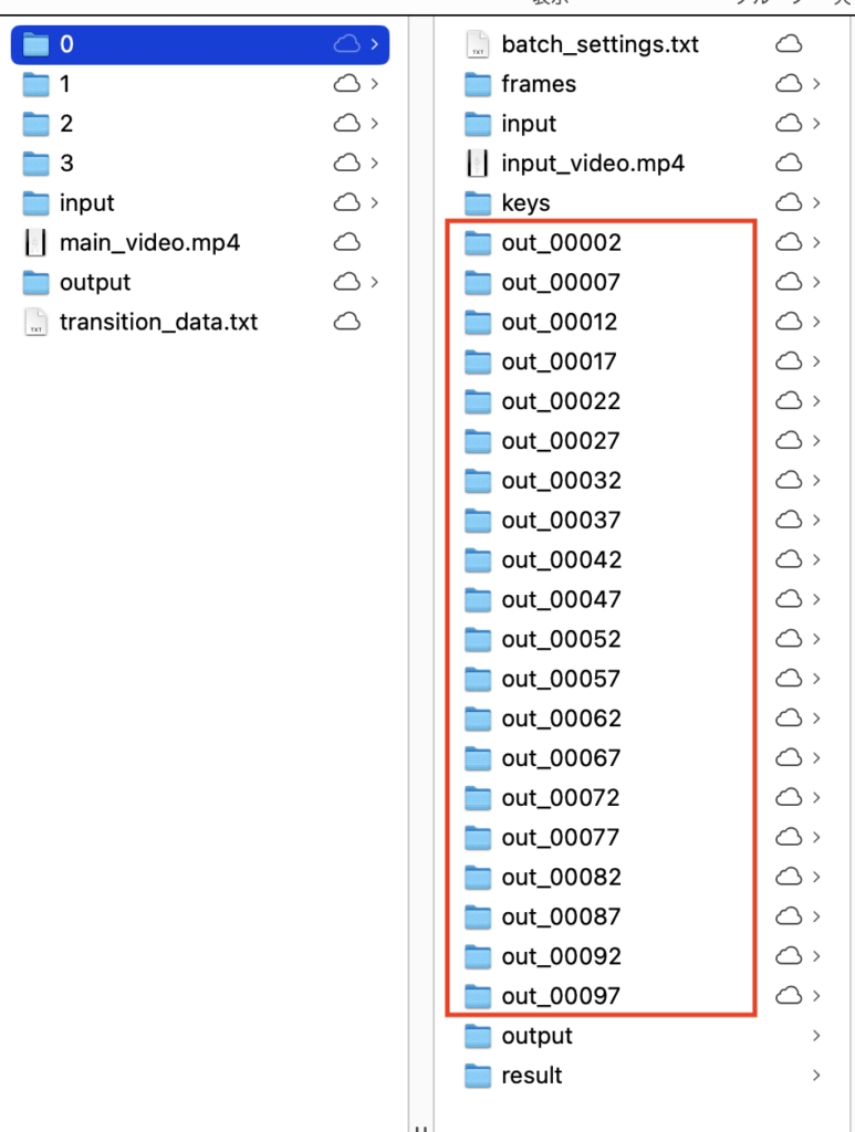 ②で作成したファイルの中の「数字」のファイルの中の「keys」と「frames」に画像が振り分けられています。これをEbSynthで処理していきます。