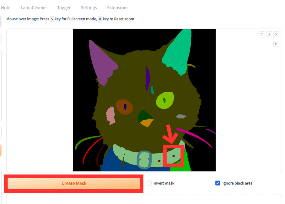 「Create Mask」ボタンをクリックするとセグメント化した画像の下にマスクされた画像が表示されます。(マスクされた部分は少し発光しています。)