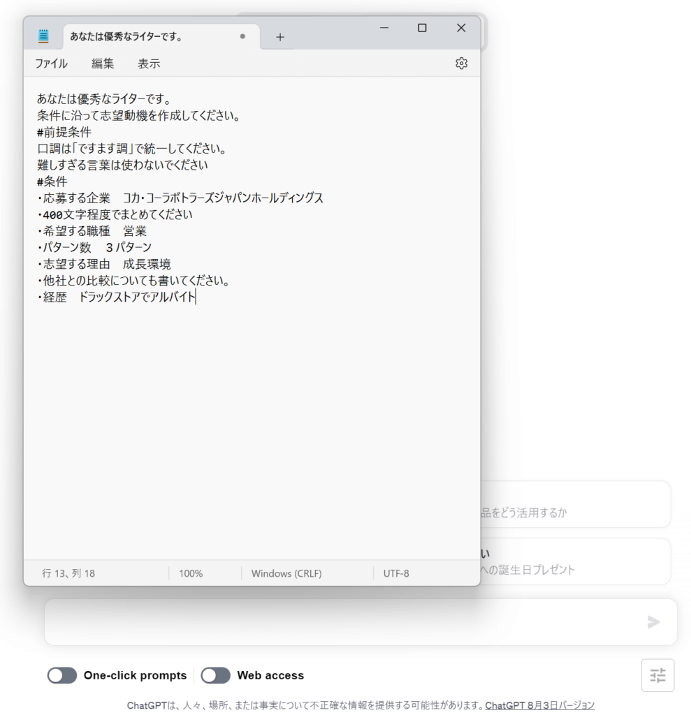 ChatGPTのEnterで誤送信を防ぐ方法としてPCにあるテキストエディタ(メモ帳)を使う方法もあります。こちらは細かいプロンプトを作成するときなどにおすすめの方法です。