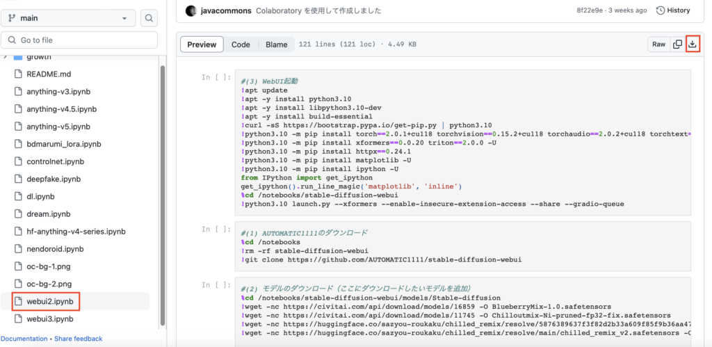 「webui2.ipynb」というファイルを選択し、右上のダウンロードボタンからダウンロードしてください。