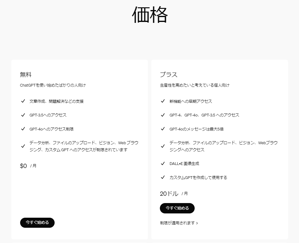 | 機能 | 無料プラン | ChatGPT Plusプラン |