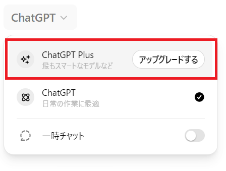 ①ChatGPTのトーク画面左上の「アップグレードする」をクリック