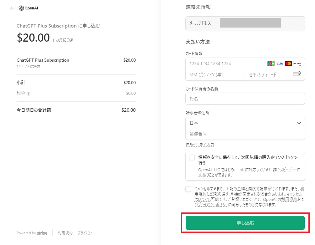 ③クレジットカードの情報・カード保有者の名前・請求書の住所などを入力し、「申し込む」をクリック