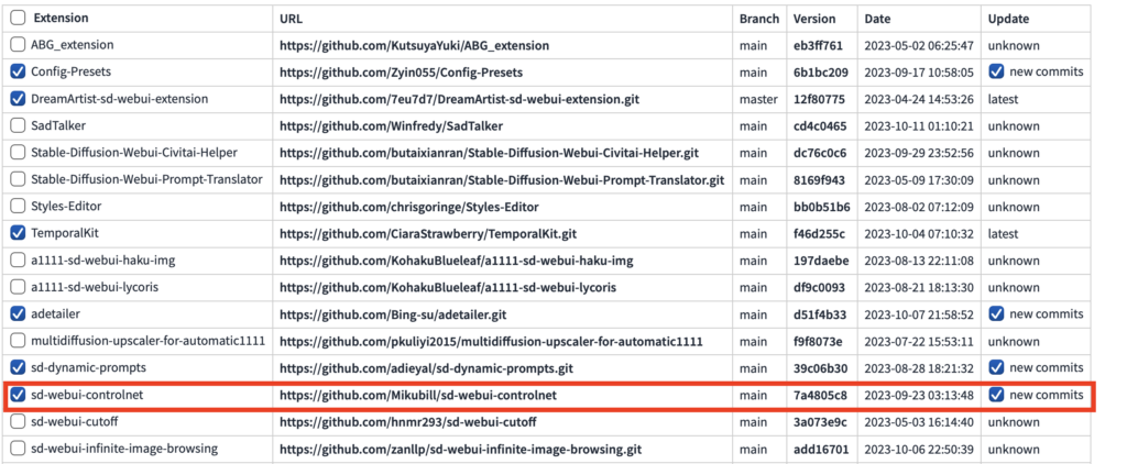web ui を起動して、Extensionsのタグから導入済みの拡張機能の状況を確認することができます。