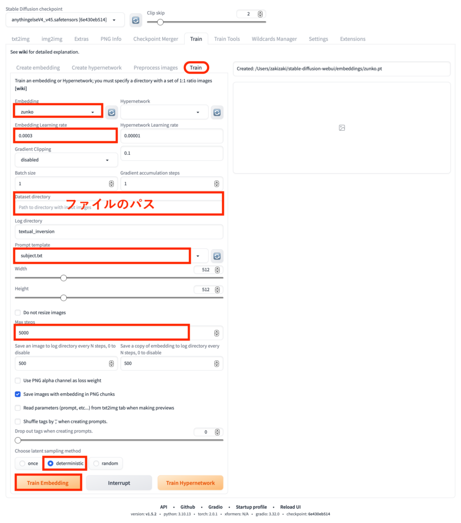 「Created: stable-diffusion-webui/embeddings/zunko.pt」このコメントが出たらtrain終了です。