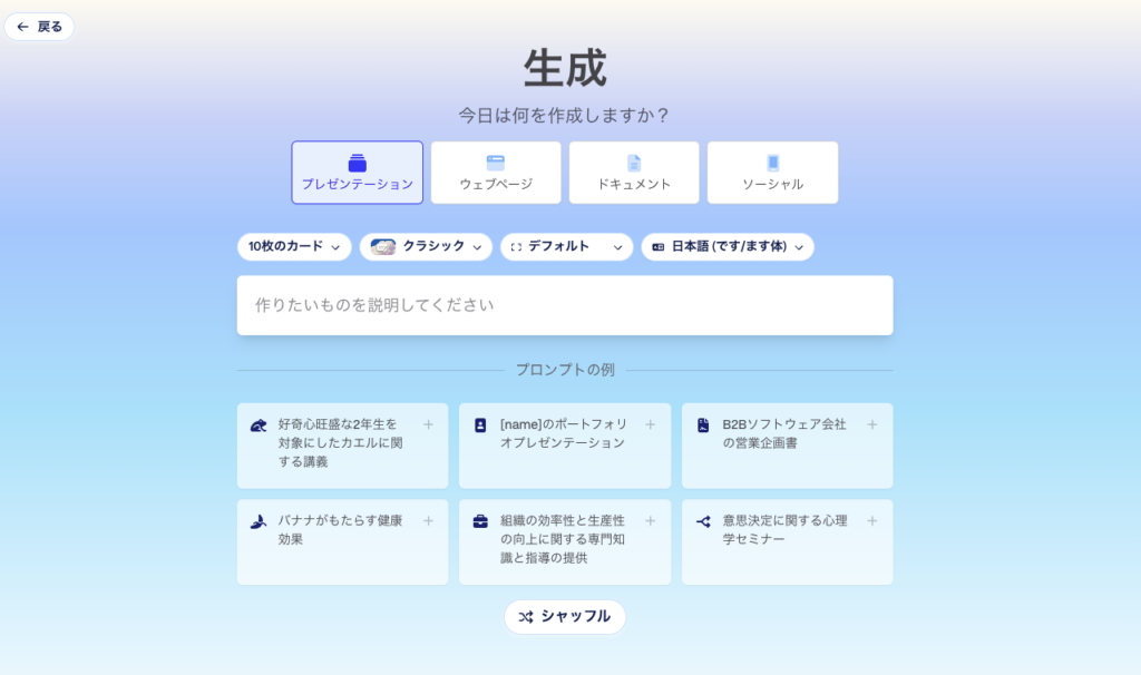 生成速度が非常に速く、デザイン性の高いスライドを短時間で作りたい方におすすめのツールです。
