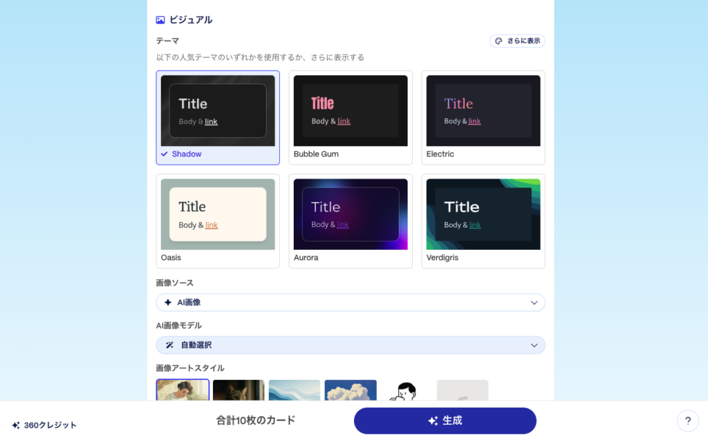 スライドを選択すると、テーマや生成する枚数を選択できます。