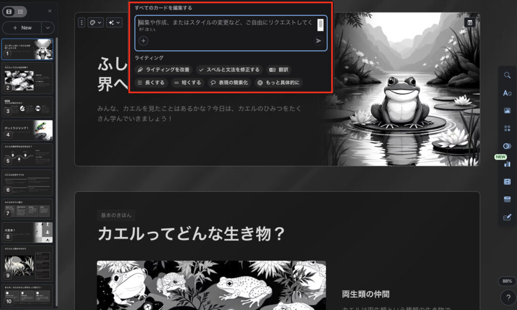 Gamma 3.0では「Gamma Agent」という世界初のAIデザインパートナー機能が実装され、自然言語での指示だけでプレゼン全体を編集・改善できるようになりました。