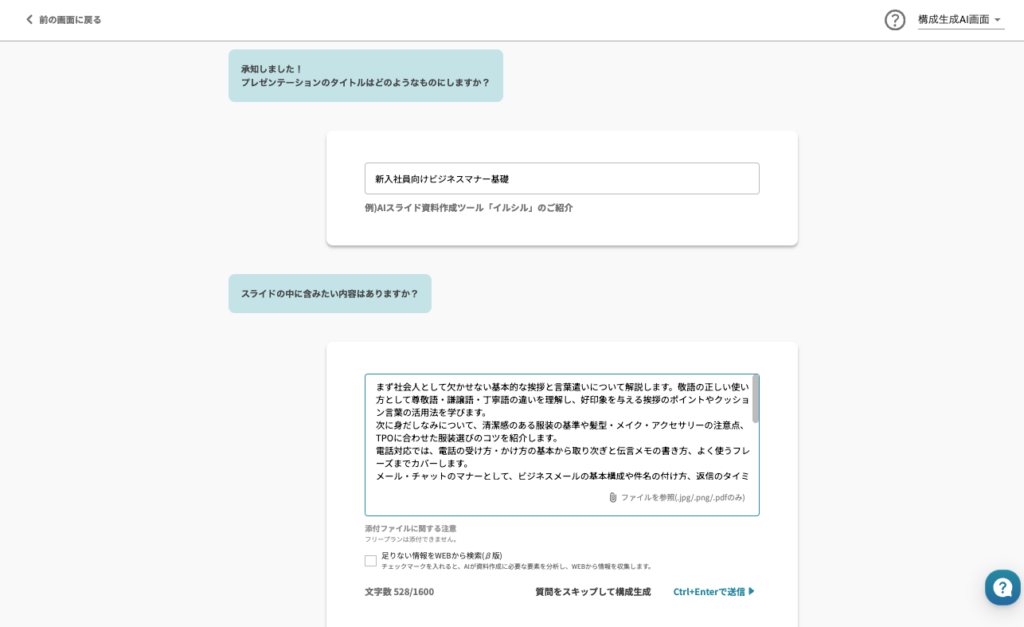 背景を詳しく伝えることで、AIはあなたの意図をより正確に反映した資料を作成します。