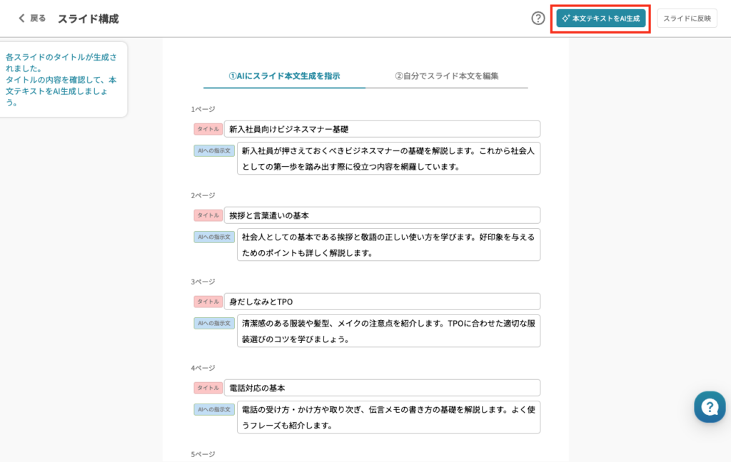 ページごとのタイトルとAIへの指示文を確認し、必要に応じて編集を加えたら、画面右上の「本文テキストをAI生成」を選択します。確認画面で「生成」をクリックすれば処理が進みます。