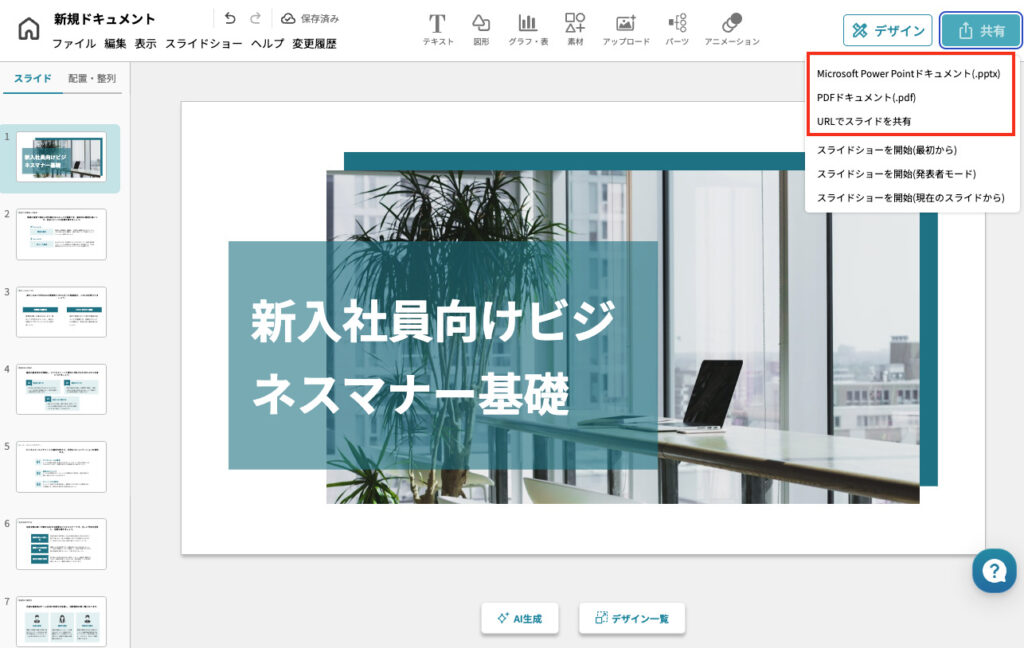 有料プランであれば、ブラウザ上で作成したスライドをPDFファイルやPPTX(PowerPoint)形式、Google slides形式で出力できます。