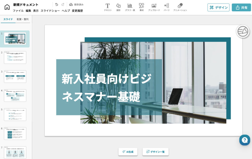 生成されたスライドを確認し、必要に応じて文章やデザインを編集します。3,000種類以上の日本語対応テンプレートから、目的に合わせたデザインに変更することも可能です。