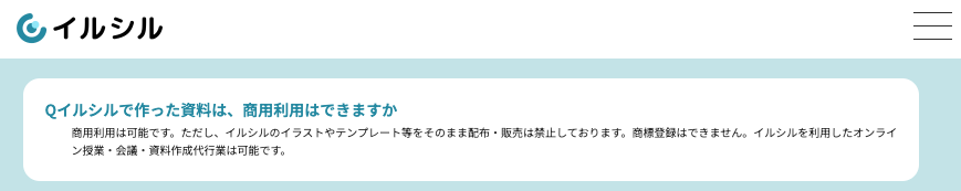 イルシルも商用利用は可能です。公式サイトのFAQでは「商用利用は可能です。ただし、イルシルのイラストやテンプレート等をそのまま配布・販売は禁止しております。商標登録はできません。イルシルを利用したオンライン授業・会議・資料作成代行業は可能です」と回答されています。