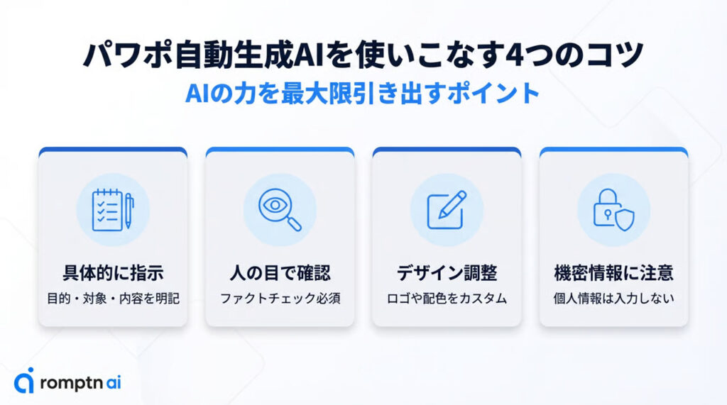 AIの能力を最大限に引き出すには、コツを押さえておく必要があります。これから紹介する4つの点を意識するだけで、生成される資料の完成度は格段に向上するはずです。