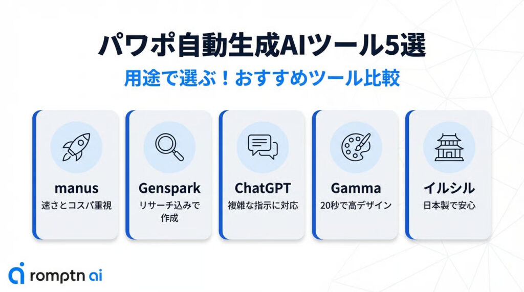 この記事では、無料で試せるパワポ自動生成AIのおすすめ5選や、その中でも特に初心者におすすめな「manus」の魅力、AIを使いこなすためのコツまで詳しく解説します。