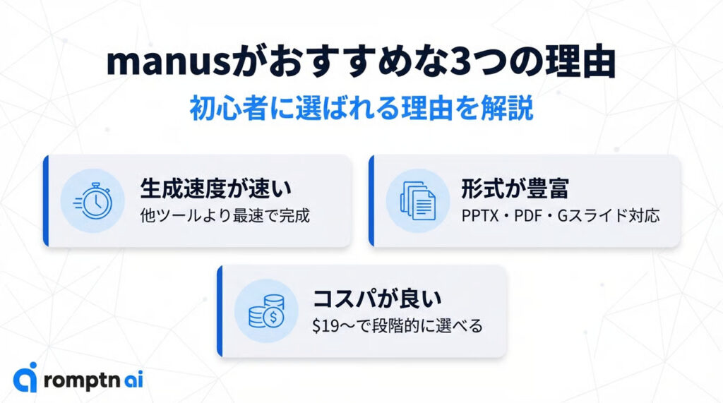 - 無料で手軽にパワポを自動生成したいなら、まずはmanusを試すのがおすすめ