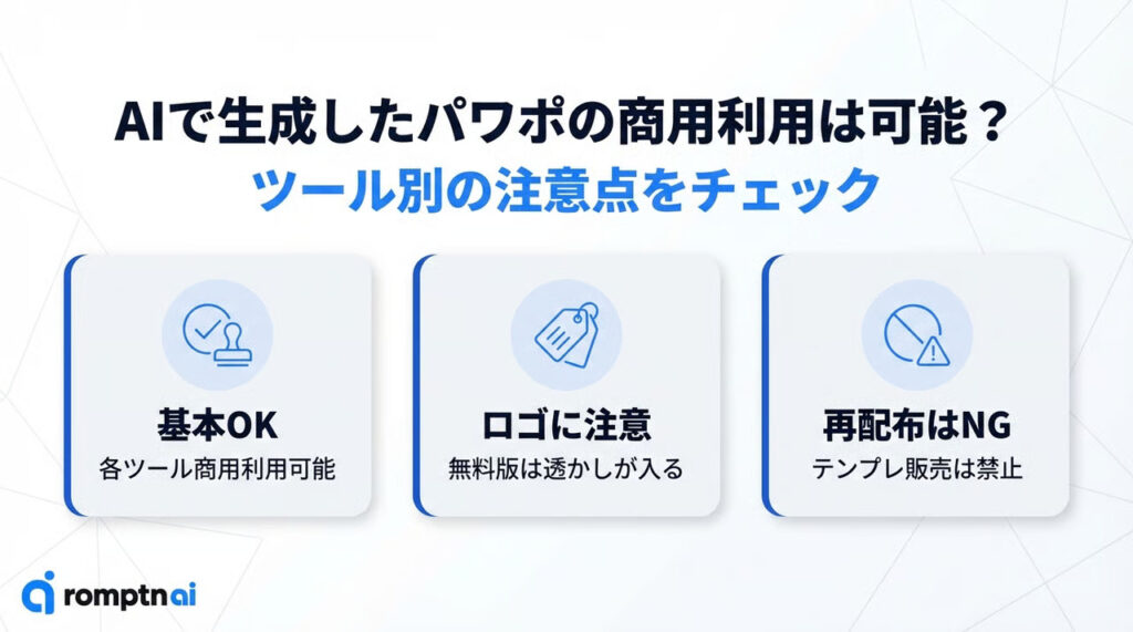 結論から言えば、今回紹介したAIツールで作成したスライドは、基本的に商用利用が可能です。ただし、各ツールごとに注意すべきルールがあります。