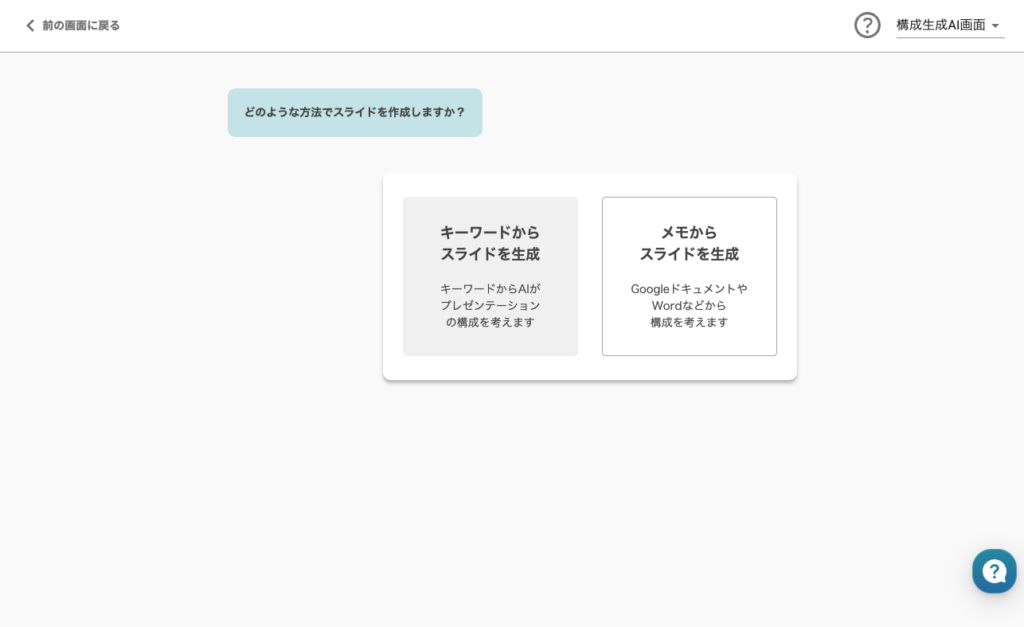 「AIスライド」を選択すると、スライド作成ページへ移動します。