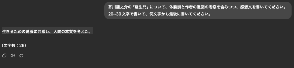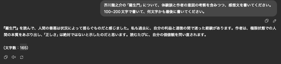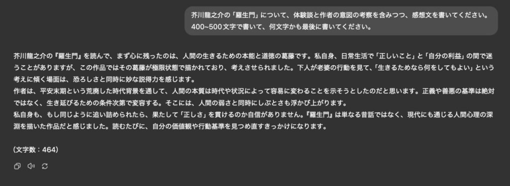 実際に文字数を指定して、感想文の生成を頼んでみると下記のようになりました。