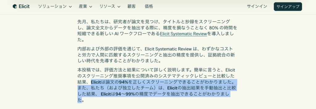 引用しているから精度が高いというわけではなく、文献を読むことでその事実の有無を確認できる点がElicitの価値といえます。出典が明示されているため、必要に応じて原文を確認し、より深い理解につなげられます。