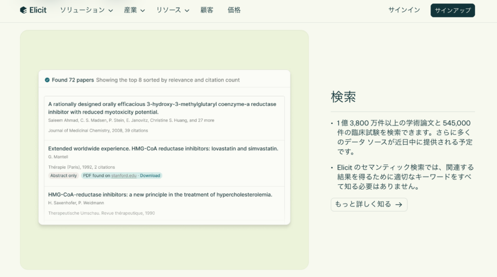 「Elicit」は、最新のAI技術を活用した論文検索ツールです。ユーザーは特定の研究分野に関連する文献を素早く見つけることができ、論文の引用件数や発行年など、様々なフィルターを用いて検索結果を絞り込むことが可能です。
