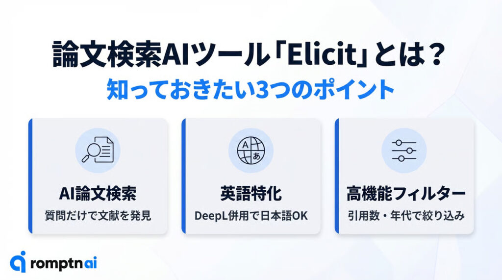 Elicitは学術文献に限定してAIを用いた検索ができ、フィルタリングや要約機能が充実したツールです。ChatGPTなどの汎用AIとは異なり、学術研究に特化した設計が最大の強みとなっています。