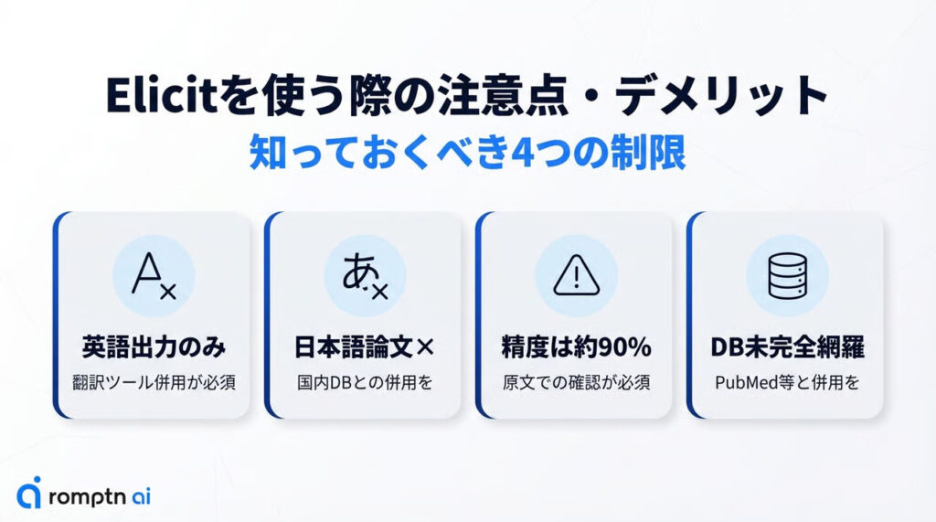 Elicitは非常に便利なツールですが、万能ではありません。AIツールである以上、いくつかの限界や注意すべき点が存在します。これらを理解したうえで活用することで、より効果的に研究を進められます。