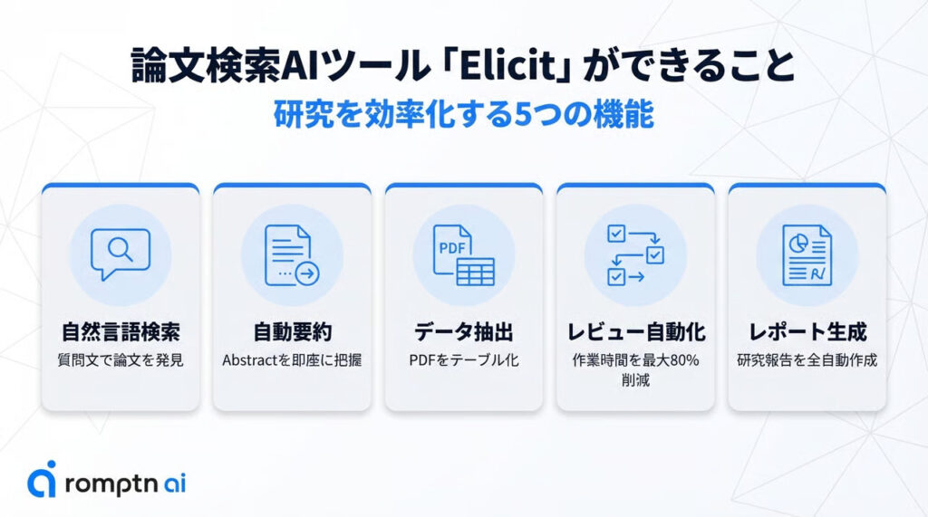 Elicitは、AIが膨大なデータベースから関連性の高い文献を探し出し、要約やデータ抽出まで自動化してくれる研究支援ツールです。従来の論文検索では何時間もかかっていた作業を大幅に効率化できます。