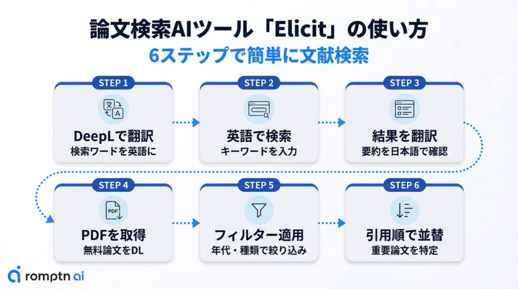 「Elicit」を使用することで、研究者は特定の研究分野やトピックに関連する文献を簡単に見つけることができます。以下では、「Elicit」の基本的な使い方を詳しく解説します。