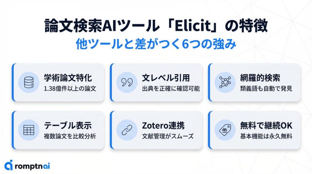 ChatGPTやPerplexityなどの汎用AIツールは、Webサイトやニュース記事など幅広い情報源を参照しますが、Elicitは検証済みの学術ソースから構造化された引用可能な結果を提供します。そのため、論文執筆やレポート作成において信頼性の高い情報を得られます。