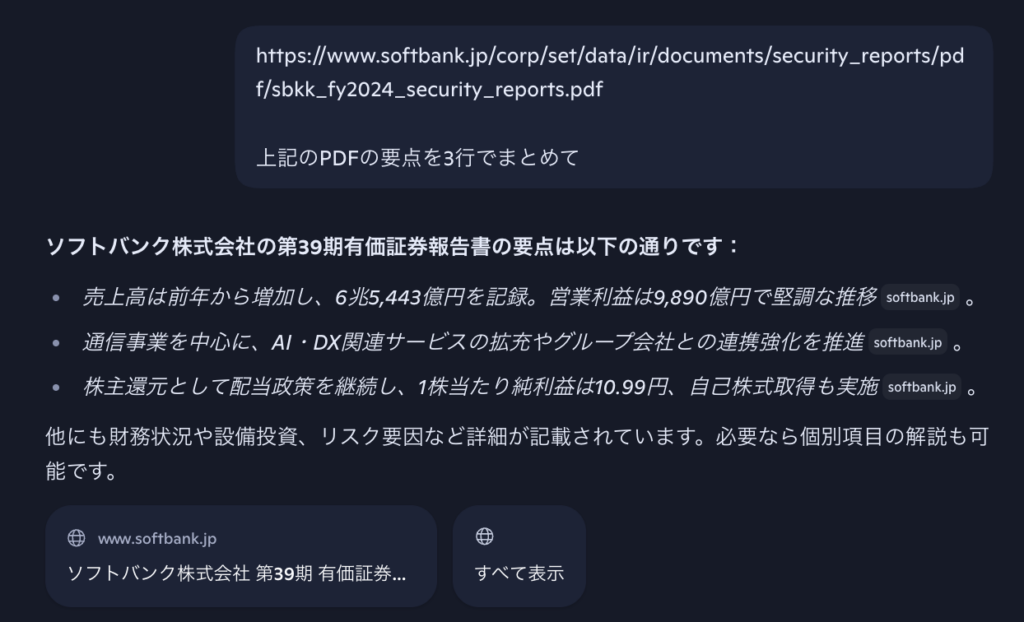 例えば上記のような形で会社の決算のような読みにくいニュースを簡単にインプットすることが可能です。また、知りたいポイントを明記すればより細かく知りたい話題だけをまとめることもできます。