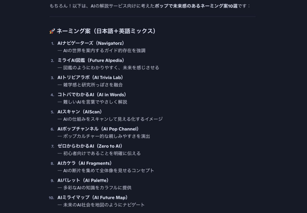 「新サービスのネーミング案を10個出して」と入力すれば、創造的なアイデアを即座に提案してくれます。会議前の準備が劇的に効率化されます。