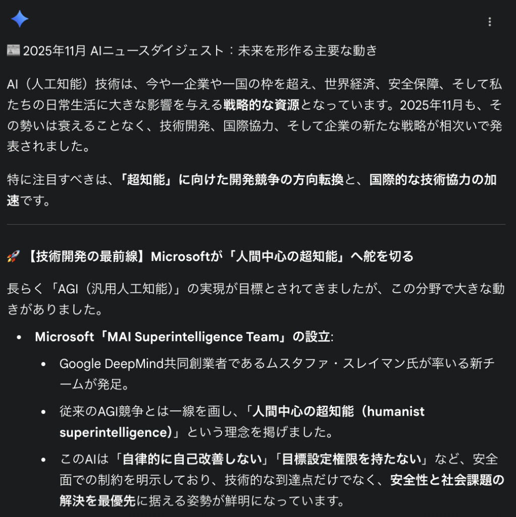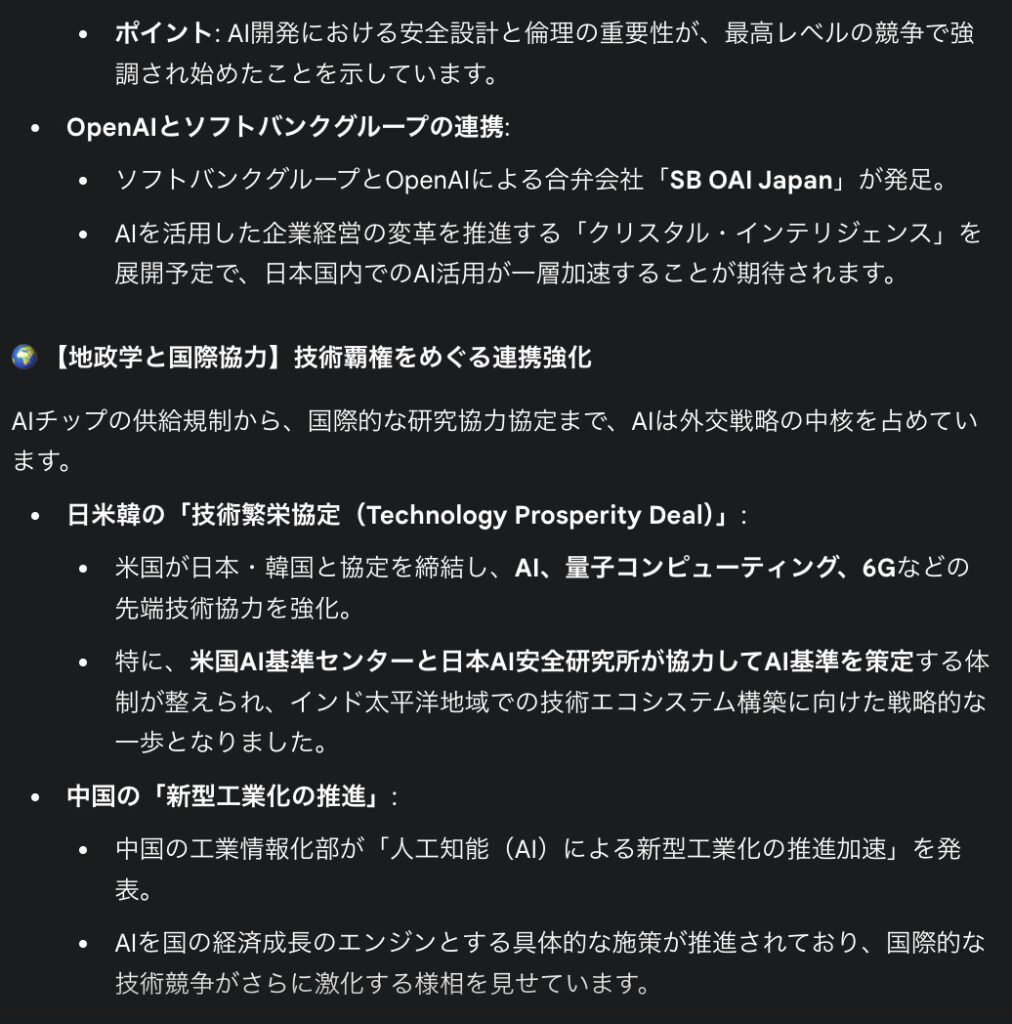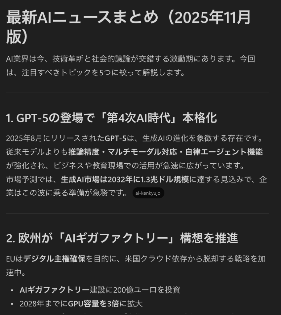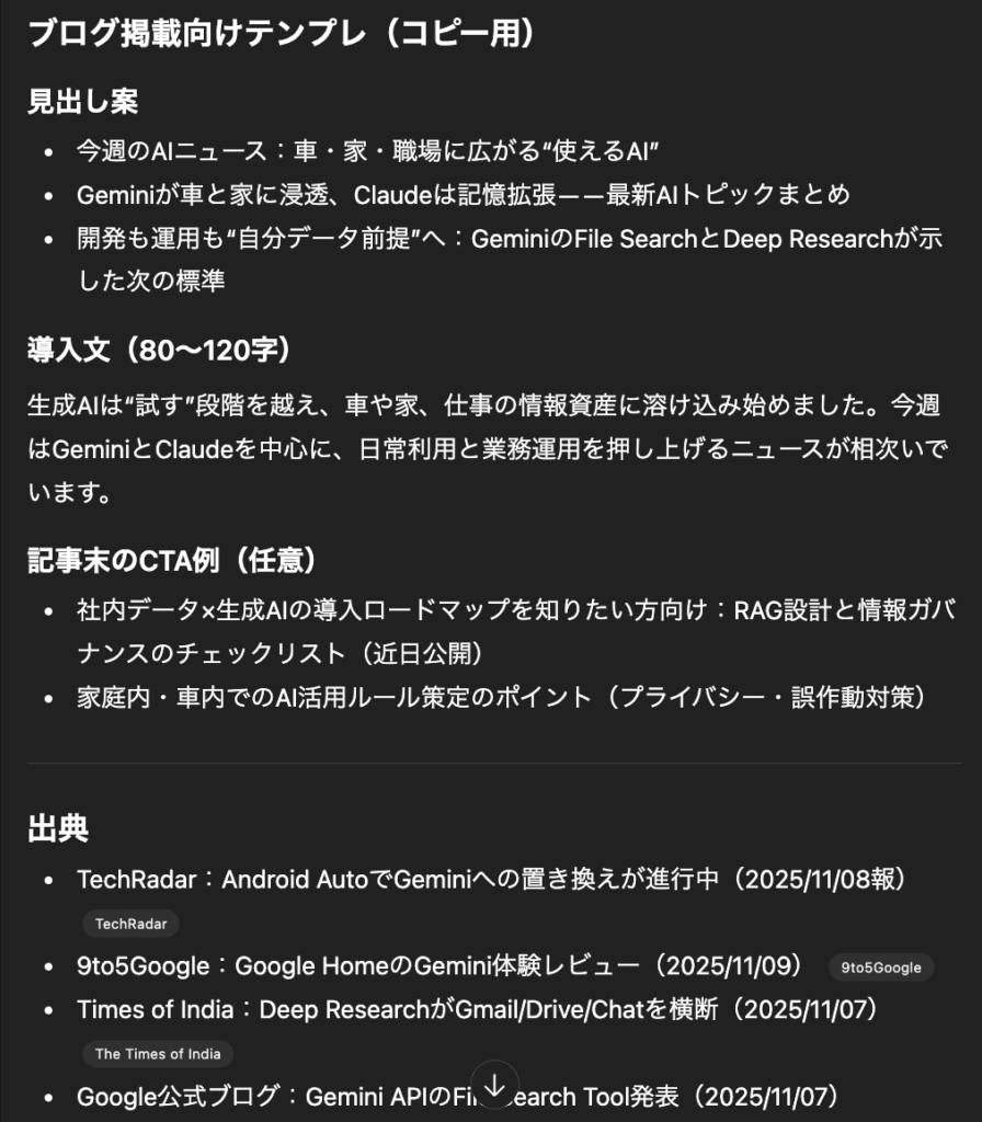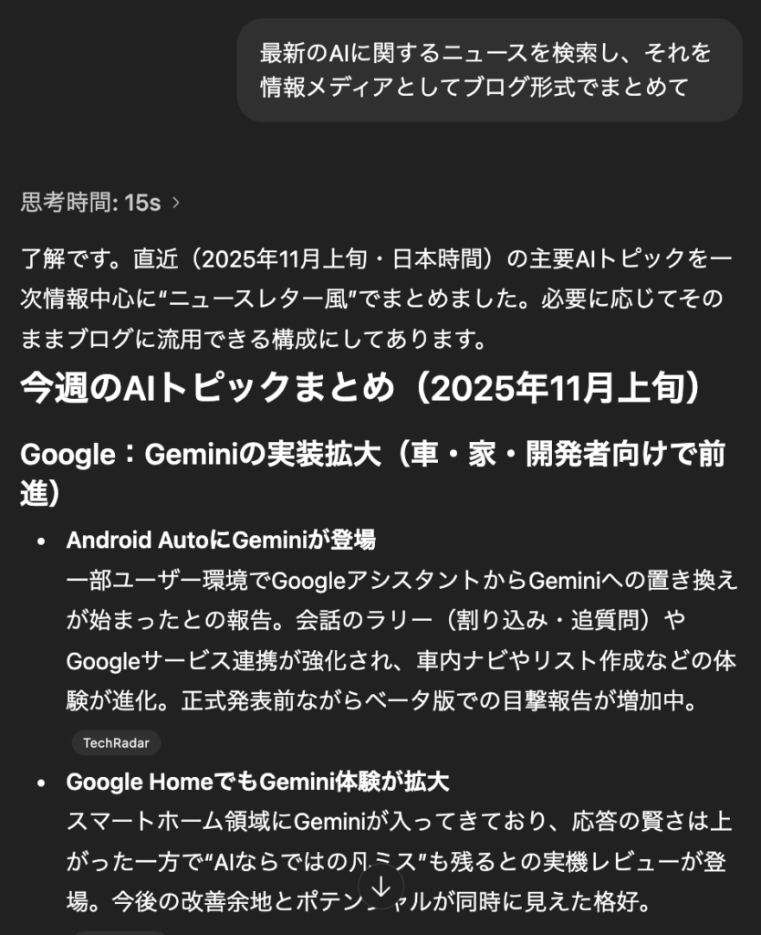 「最新のAIに関するニュースを検索し、それを情報メディアとしてブログ形式でまとめて」とプロンプトを入力したところ、それぞれのアウトプットは以下の通りでした。