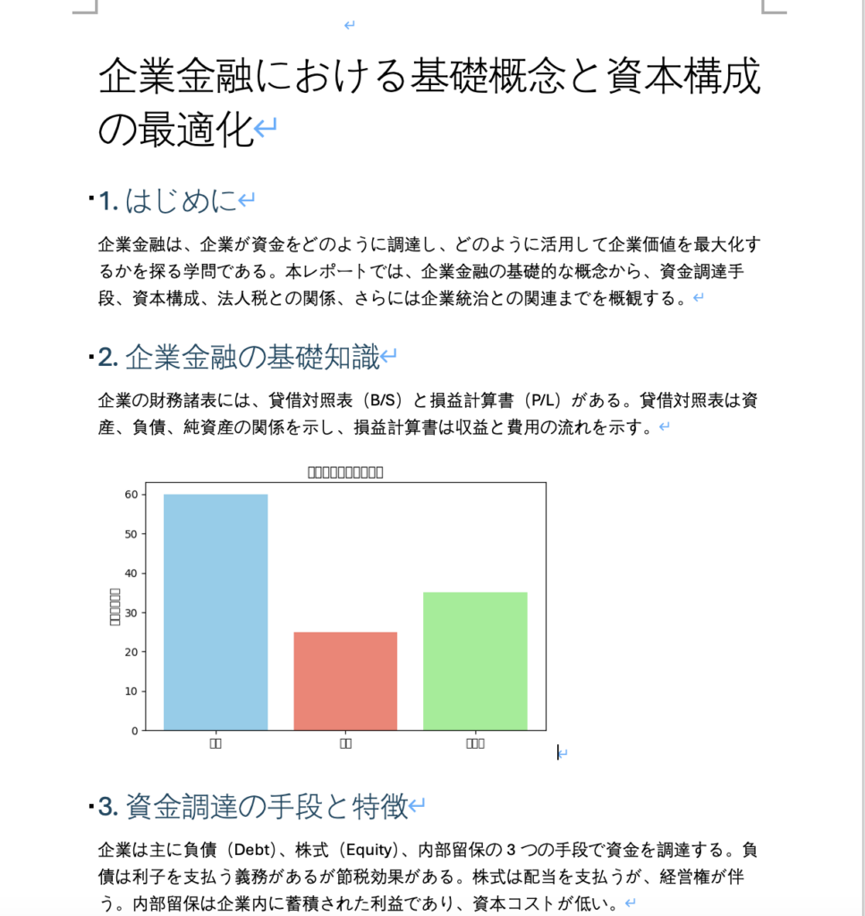 CopilotはWordでの出力が可能です。体裁としては一定整っているものの、文字化けがひどかったり、各章の文章量が乏しかったりと実用には程遠い性能でした。