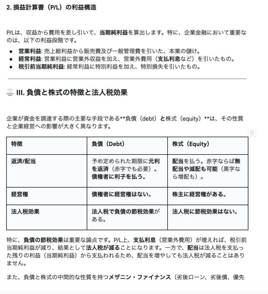 レポートの生成に関してはGeminiの一強と言っても良い性能です。文章量も豊富で表の生成も可能であるため、レポートの土台としては十分すぎるアウトプットが得られました。