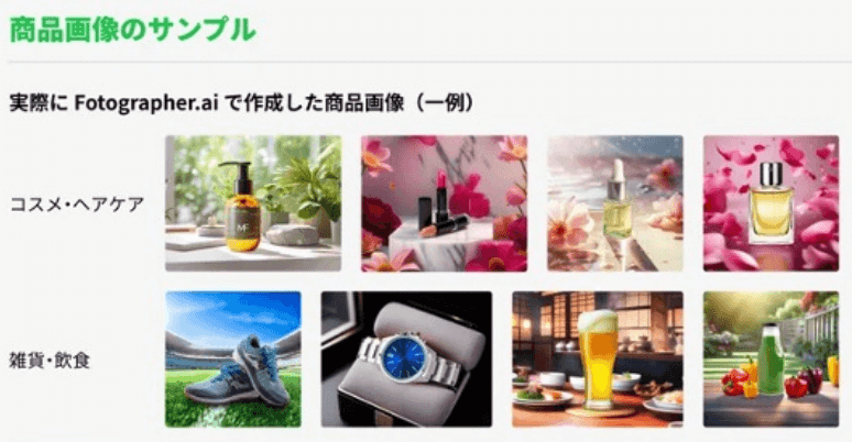 - Fotographer.aiは、EC事業者や広告クリエイティブ関係者向けに、生成AIを用いて商品画像を自動生成できるサービスを提供しています。ユーザーは商品画像をアップロードし、作成したいイメージを文字で入力するかテンプレートを選択するだけで、短時間でクリエイティブな商品画像を作成できます。また、花や果物、土台や手などの素材を自由に配置し、理想の構図で商品画像を作成することも可能です。