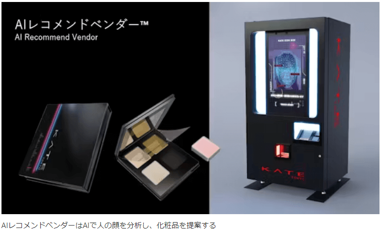- AIレコメンドベンダーは、すでにカネボウ化粧品のブランド「KATE」の商品やメーク方法を提案する「KATE iCON BOX」として導入されており、現在は東京・原宿の化粧品販売店に設置されています。KATE iCON BOXは、顔の分析結果をもとに26色の単色アイシャドーから4色を提案し、メーク方法を画面で紹介します。利用者は、個人に合わせたオリジナルのアイシャドーパレットを受け取り、レジで会計します。