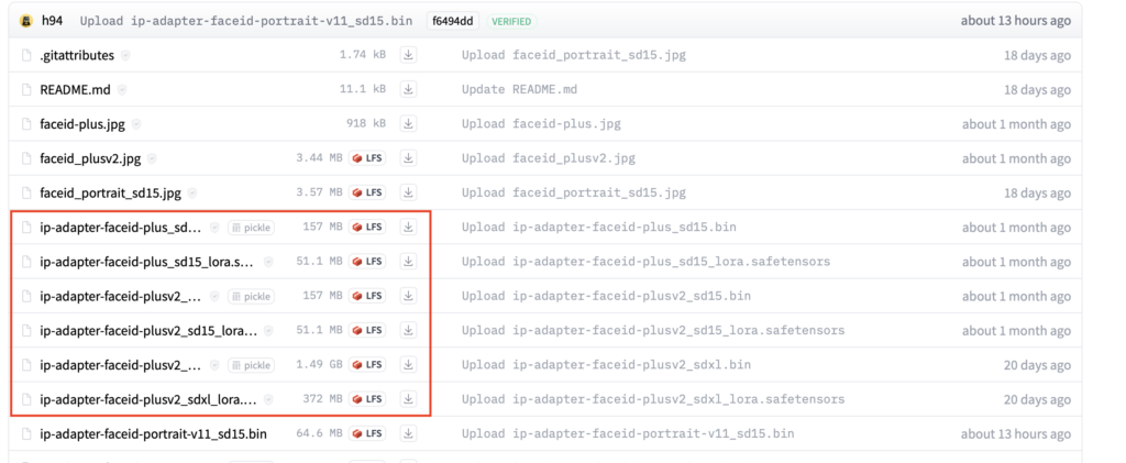 たくさんファイルがあり過ぎて分かりにくいですが赤で囲った部分が必要になります。専用のLoraもセットになっているので忘れずにダウンロードしてください。