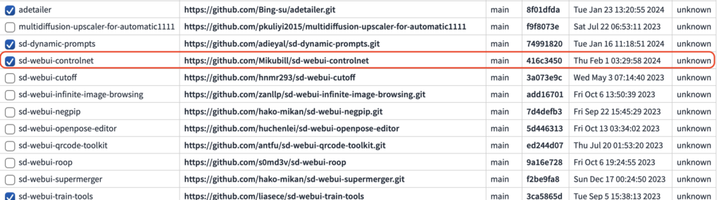 webuiを起動して、「Extentions」タグからCheck for updatesクリックしてControlNetのバージョンを確認しましょう。