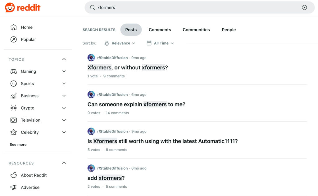 Redditのホーム画面にある検索欄から「xformers」と入力することで、こちらもたくさんの検索結果を得ることができ、xformersに関する情報を集めることが可能です。