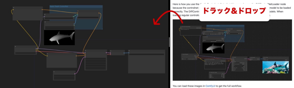 - ControlNetを使うには公式のワークフローをドラック&ドロップする