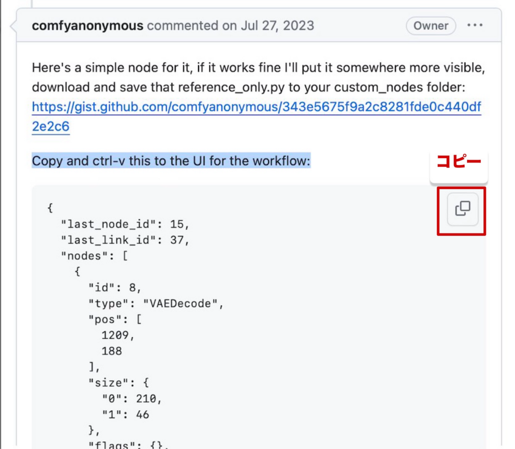 サイト上にある画像をComfyUIの画面にドラッグ&ドロップすることで、公式ワークフローを読み込むことができます。