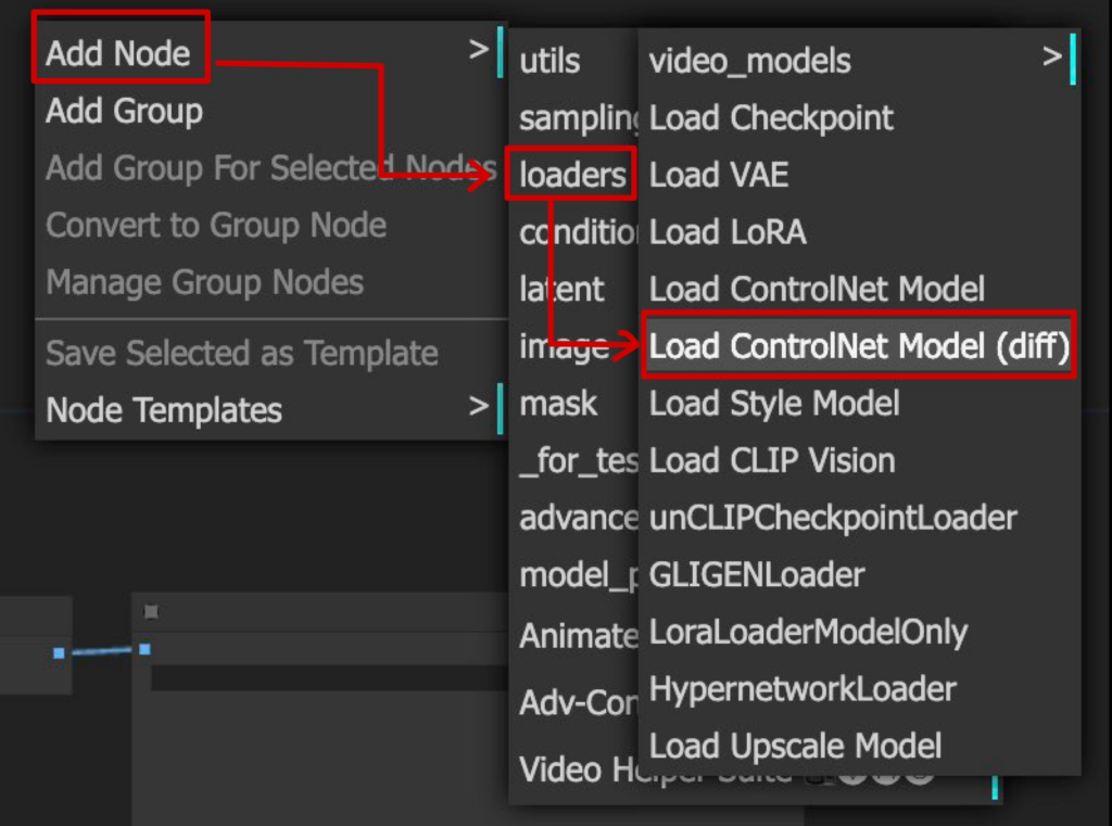 ※「LoadControlNet Model Model(diff)」は、「AddNode>Loaders」カテゴリ内にあります。