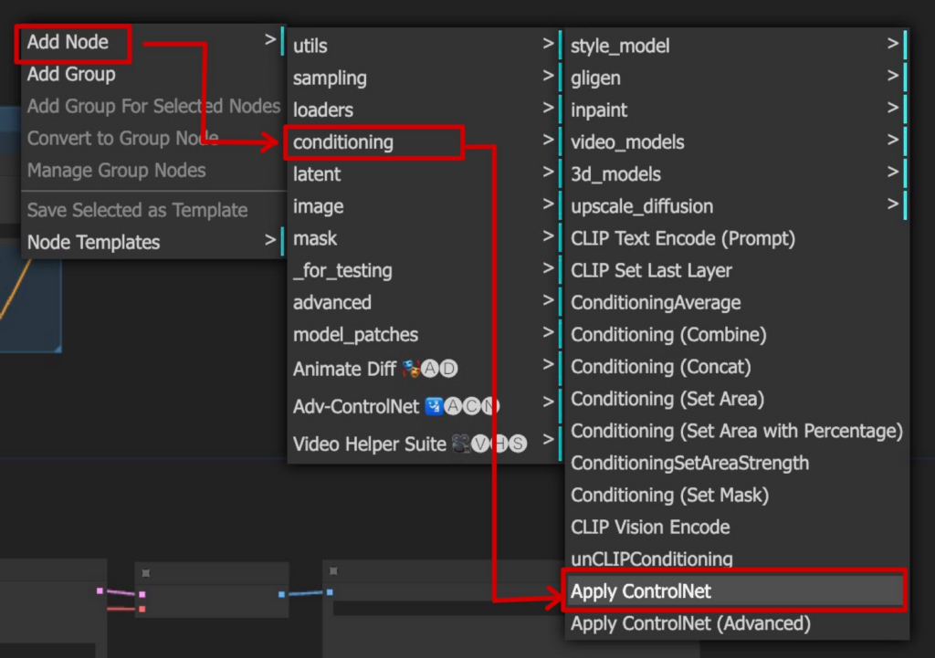 ※「Apply ControlNet」は「AddNode>Conditioning」カテゴリ内にあります。