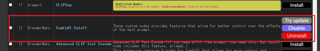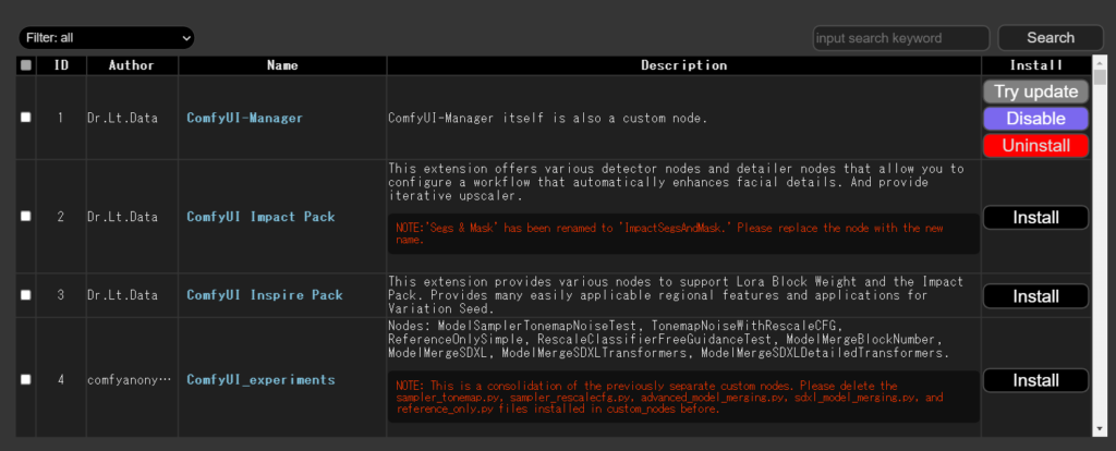 この項目では、導入しているorできるComfyUIの拡張機能が一覧で表示され、インストールやアンインストールができたり、無効化・有効化の変更が出来たりといろいろな管理ができるようになっています。