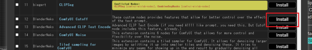 先程、ComfyUI-Managerから拡張機能がインストールできると話しましたが、試しに1つ「ComfyUI CuyOff」という拡張機能をインストールしてみましょう!