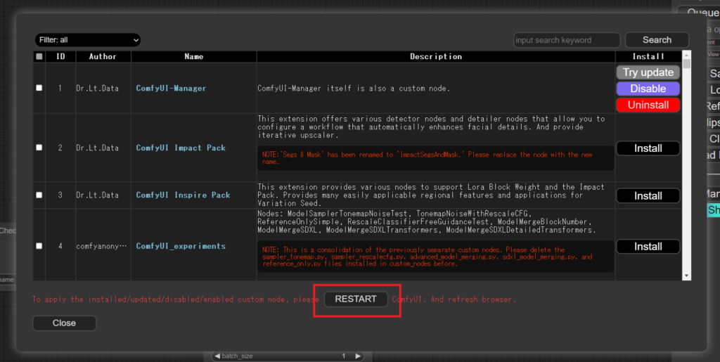 再起動後に、『Manager』→『Install Custom Nodes』からちゃんとインストールされているか確認しましょう。