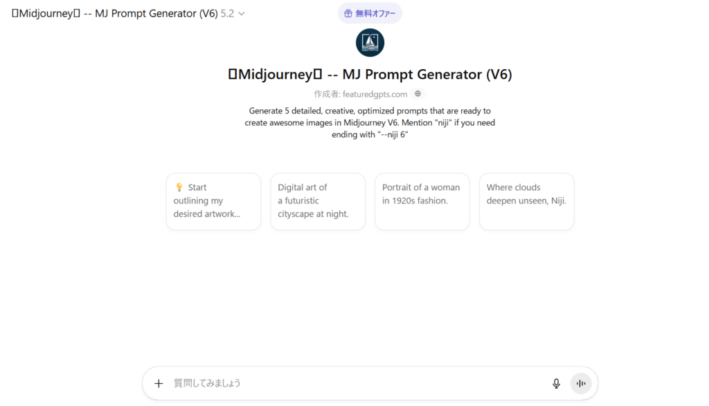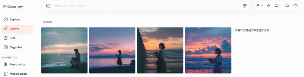 Discord版と違って「/imagine prompt:」を入力する必要がないので、プロンプトだけ書けばOKです!