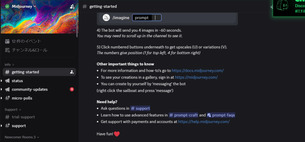 現在、Midjourneyの操作画面自体を日本語化する公式機能はありません。
