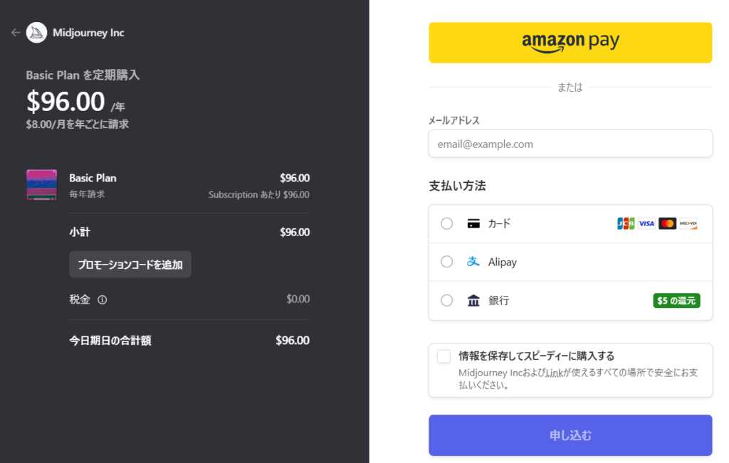 Midjourneyの支払いは、クレジットカードのみ対応しています。